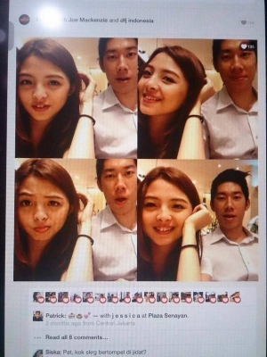 Foto satunya lagi ada empat foto selfie Jeje dengan seorang pria berkemeja putih. "With Jessica at Plaza Senayan,"tulis akun Patrick lagi.
